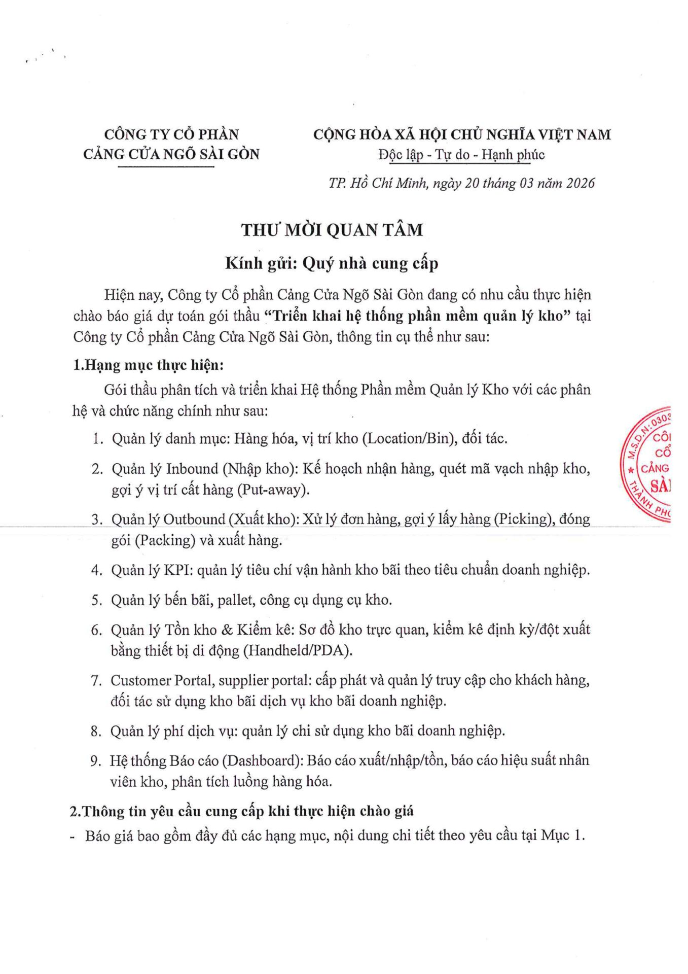 Thư mời quan tâm – Triển khai hệ thống phần mềm quản lý kho tại Công ty Cổ phần Cảng Cửa Ngõ Sài Gòn SGT