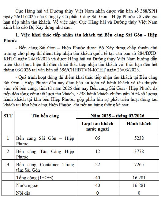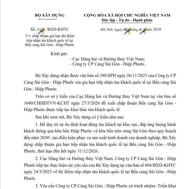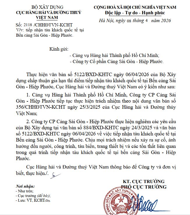 Về việc chấp thuận gia hạn thí điểm tiếp nhận tàu khách quốc tế tại Bến cảng Sài Gòn-Hiệp Phước, Cảng Saigon Gateway Terminal (SGT)
