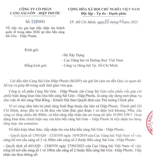 Về việc xin gia hạn tiếp nhận tàu khách quốc tế trong năm 2026 tại khu Bến cảng Sài Gòn-Hiệp Phước, Cảng Saigon Gateway Terminal (SGT)